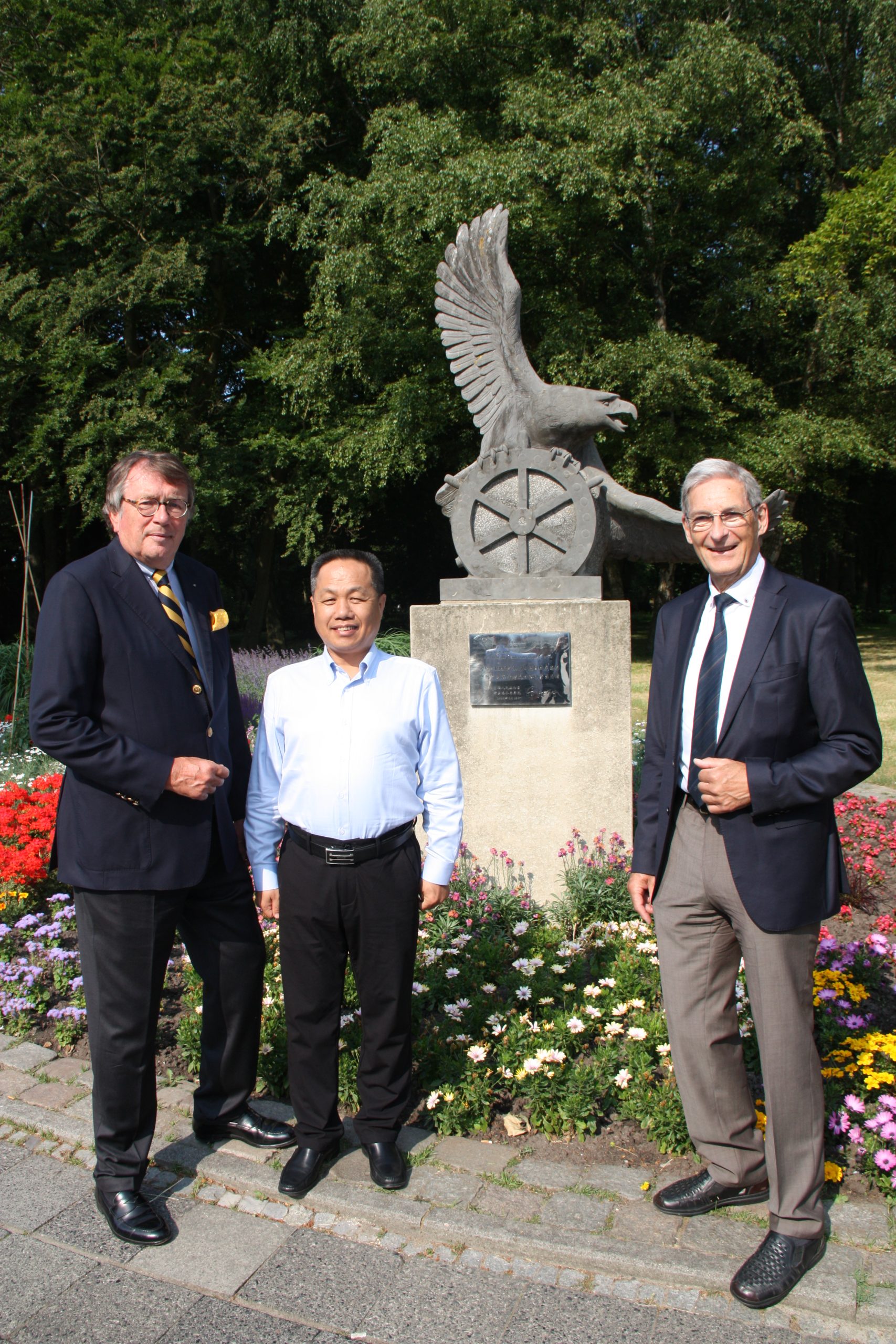 Bild oben: in der Bildmitte WHV e.V. Präsident John H. Niemann, Qingdao Port Group Board Chairman Su Jianguang und Vizepräsident der WHV e.V. Hans-Joachim Uhlendorf eingerahmt von der Delegation aus Qingdao vor dem Adler am Rande des Friedrich-Wilhelm-Park. PhotoAdler-Group: