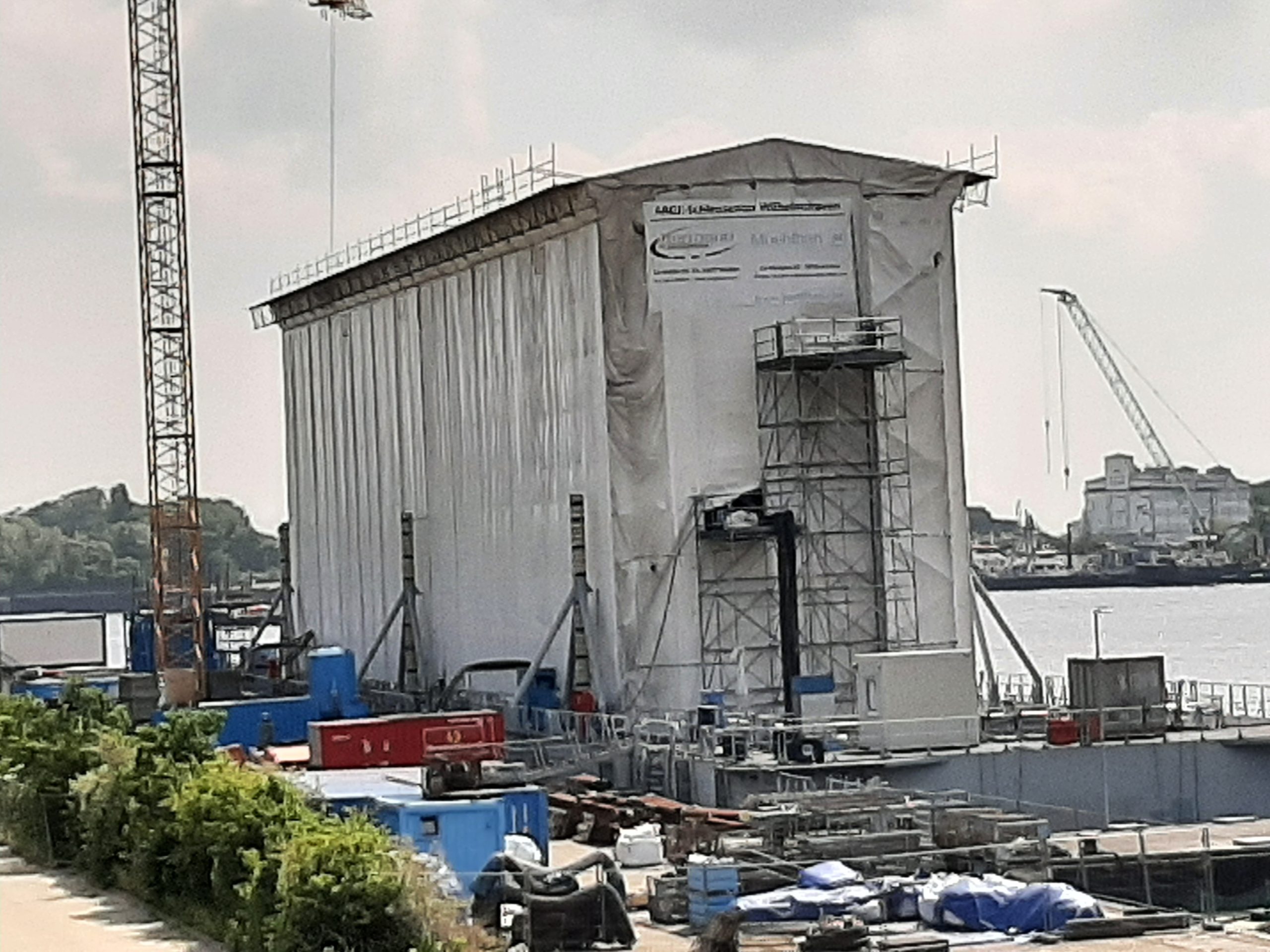 Die im Hafengeschehen Eingeweihten wissen jedoch, dass sich seit 2010 dort das fünfte Schleusentortor unter den Abdeckplanen versteckt. Und ja, es wird dort gearbeitet.