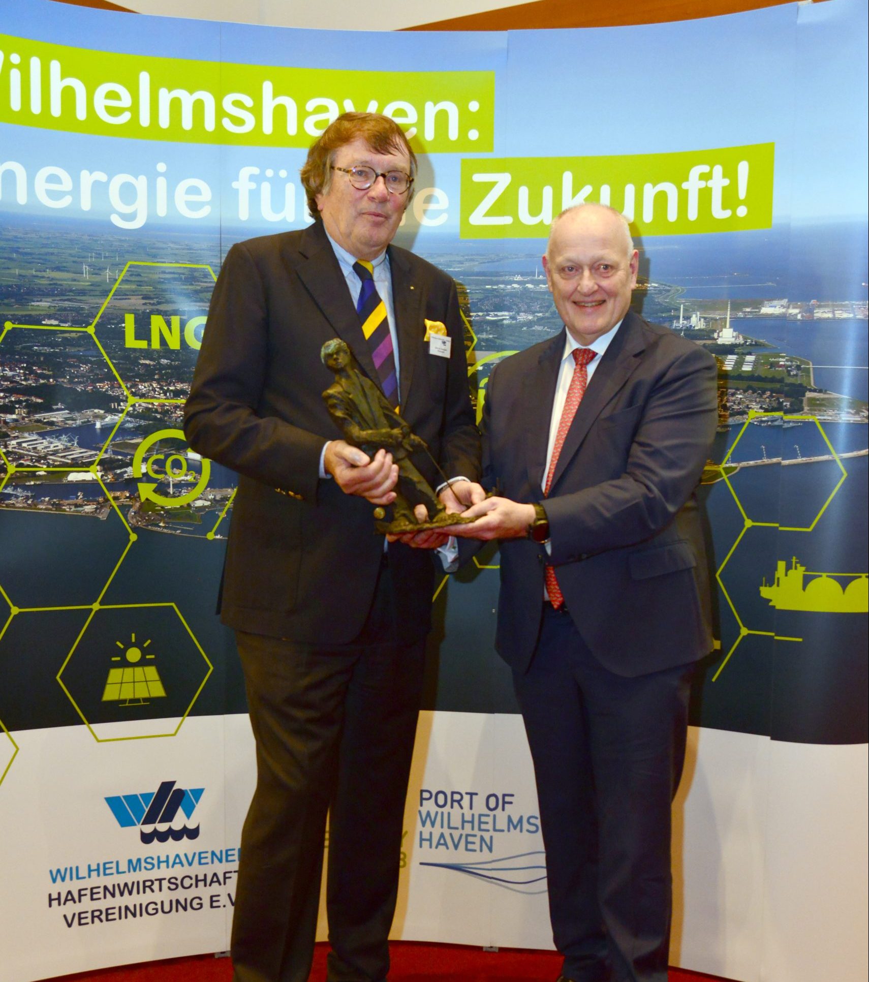 Ein Höhepunkt der Mitgliederversammlung war die Verleihung des Treidlers, des Unternehmerpreises der Wilhelmshavener Hafenwirtschafts-Vereinigung e.V., an Paul van Poecke, TES, für sein Engagement um die maritime Wirtschaft und für Wilhelmshaven und ganz besonders für das beispielhafte Projekt des grünen Energieparks im Rahmen eines großen weltweiten Kreislaufsystems und als Meilenstein für den Klimaschutz und die Energie-Versorgungssicherheit Deutschlands aus.