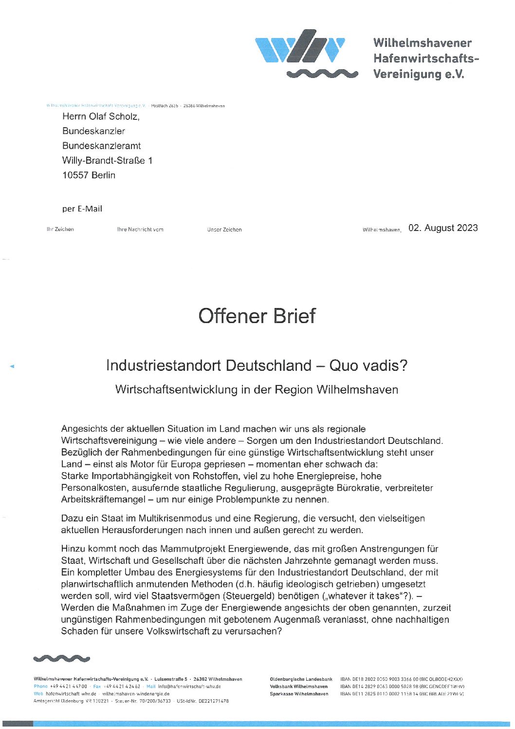 als Anhang beigefügt übersenden wir Ihnen unseren Offenen Brief zum Industriestandort Deutschland und zur Wirtschaftsentwicklung in der Region Wilhelmshaven.