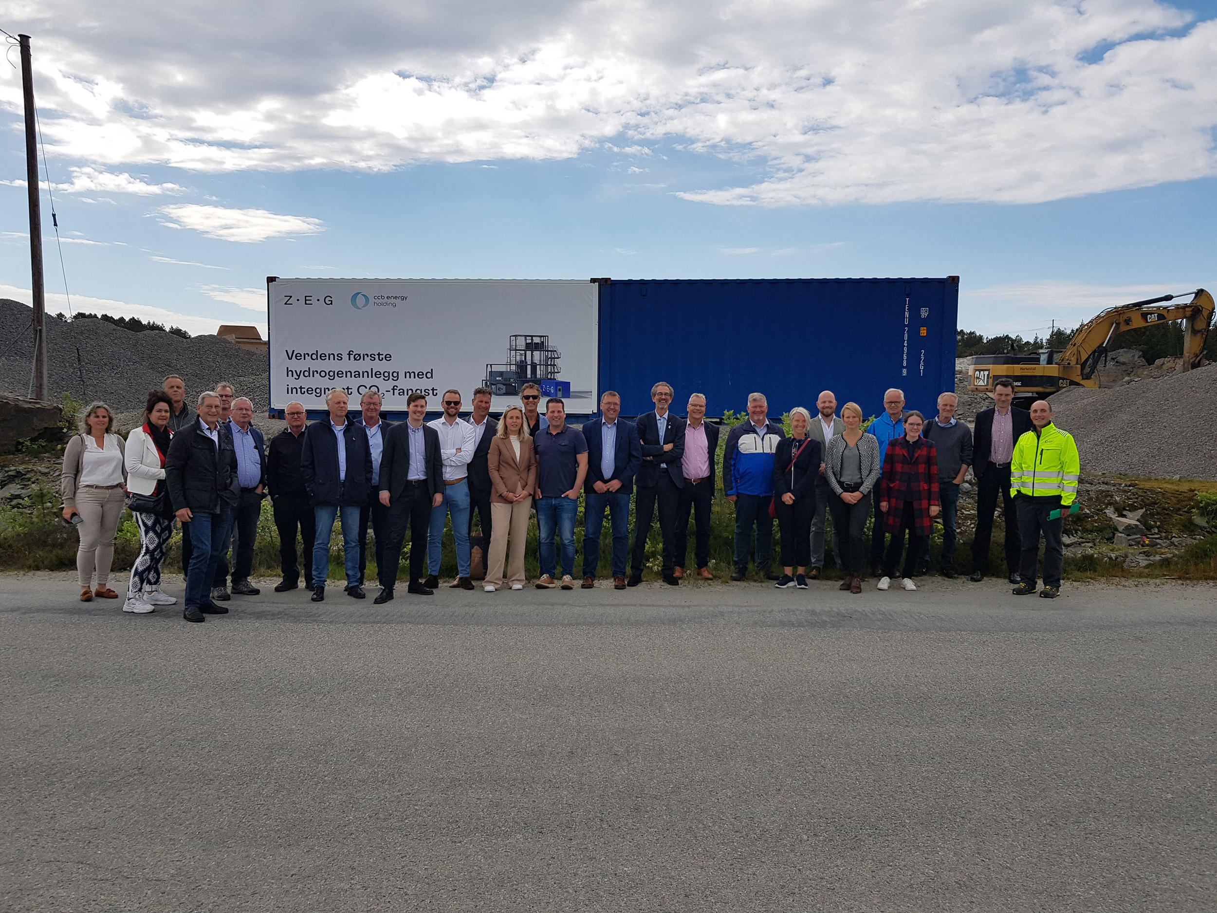Foto: 4. von links Hans-Joachim Uhlendorf Vizepräsident der WHV e.V. mit den Teilnehmern der deutsch-niederländischen Wirtschaftsdelegation in Norwegen vor der Pilotanlage eines Elektrolyseurs zur Herstellung von Wasserstoff mit CO²-Separierung