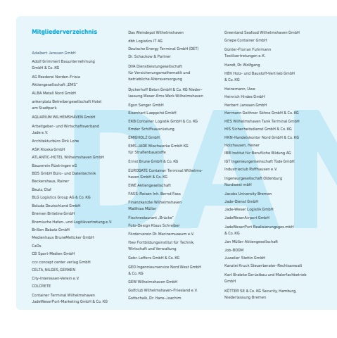 Adalbert Janssen GmbHAdolf Grimmert BauunternehmungGmbH & Co. KGAG Reederei Norden-FrisiaAktiengesellschaft %u201eEMS%u201cALBA Metall Nord GmbHankerplatz Betreibergesellschaft Hotelam Stadtpark AQUARIUM WILHEMSHAVEN GmbHArbeitgeber- und WirtschaftsverbandJade e.V.Architekturb%u00fcro Dirk LoheASK Kloska GmbHATLANTIC-HOTEL Wilhelmshaven GmbHBauverein R%u00fcstringen eGBDS GmbH B%u00fcro- und DatentechnikBeckershaus, RainerBeutz, OlafBLG Logistics Group AG & Co. KGBoluda Deutschland GmbHBremen Briteline GmbHBremische Hafen- und Logitikvertretung e.V.Brillen Babatz GmbHMedienhaus BruneMettcker GmbHCaOsCB Sport-Medien GmbHccv concept center verlag GmbHCELTA, NILGES, GERKENCity-Interessen-Verein e.V.COLCRETEContainer Terminal WilhelmshavenJadeWeserPort-Marketing GmbH & Co. KGGreenland Seafood Wilhelmshaven GmbHGriepe Container GmbHG%u00fcnter-Florian FuhrmannTextilvertretungen e.K.Handt, Dr. WolfgangHBV Holz- und Baustoff-Vertrieb GmbH& Co. KGHeinemann, UweHeinrich Hirdes GmbHHerbert Janssen GmbHHermann Geithner S%u00f6hne GmbH & Co. KGHES Wilhelmshaven Tank Terminal GmbHHIS Sicherheitsdienst GmbH & Co. KGHKN-Handelskontor Nord GmbH & Co. KGHolzhausen, HeinerIBB Institut f%u00fcr Berufliche Bildung AGIGT Ingenieurgemeinschaft Tode GmbHIndustrieclub Roffhausen e.V.Ingeneurgesellschaft OldenburgNordwest mbHJacobs University BremenJade-Dienst GmbHJade-Weser Logistik GmbHJadeWeserAirport GmbHJadeWeserPort Realisierungsges.mbH& Co. KGJan M%u00fcller AktiengesellschaftJob-BOOMJuwelier Stettin GmbHKanzlei Kruck Steuerberater-RechtsanwaltKarl Bratzke Ger%u00fcstbau und Malerfachbetrieb GmbHK%u00d6TTER SE & Co. KG Security, Hamburg,Niederlassung BremenDas Weindepot Wilhelmshavendbh Logistics IT AGDeutsche Energy Terminal GmbH (DET)Dr. Schackow & PartnerDVA Dienstleistungesellschaftf%u00fcr Versicherungsmathematik undbetriebliche AltersversorgungDyckerhoff Beton GmbH & Co. KG Niederlassung Weser-Ems Werk WilhelmshavenEgon Senger GmbHEisenhart Laeppch%u00e9 GmbHEKB Container Logistik GmbH & Co. KGEmder Schiffsausr%u00fcstungEMIGHOLZ GmbHEMS-JADE Mischwerke GmbH KGf%u00fcr Stra%u00dfenbaustoffeErnst Brune GmbH & Co. KGEUROGATE Container Terminal Wilhelmshaven GmbH & Co. KGEWE AktiengesellschaftFASS-Reisen Inh. Bernd FassFinanzkanzlei WilhelmshavenMatthias M%u00fcllerFischrestaurant %u201eBr%u00fccke%u201cFoto-Design Klaus SchreiberF%u00f6rderverein Dt. Marinemuseum e.V.ftwv Fortbildungsinstitut f%u00fcr Technik,Wirtschaft und VerwaltungGebr. Leffers GmbH & Co. KGGEO Ingennieurservice Nord West GmbH& Co. KGGEW Wilhelmshaven GmbHGolfclub Wilhelmshaven-Friesland e.V.Gottschalk, Dr. Hans-JoachimMitgliederverzeichnis